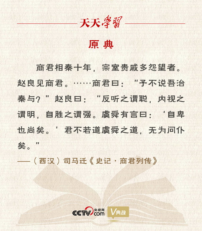 《史记·商君列传》中的这段文字,讲的是商鞅在秦国为相十年,宗室贵戚多对他怨恨不满。有一个名叫赵良的人前去拜见商鞅,告诫他说:“反听之谓聪,内视之谓明,自胜之谓强。”反听:听之于耳,虑之于心;内视:自我省察。意思是说,能听取别人意见的叫作聪明,能自我反省的叫作明智,能克制、战胜自己的叫作强者。