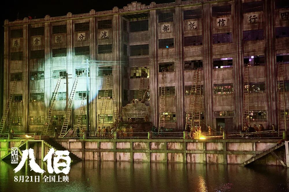 《八佰》的置景相当精致,一面是战役发生地四行仓库,另一面就是与仓库只有一河之隔的租界,仓库的满目疮痍与租界的灯红酒绿形成鲜明的对比,很有视觉冲击力。