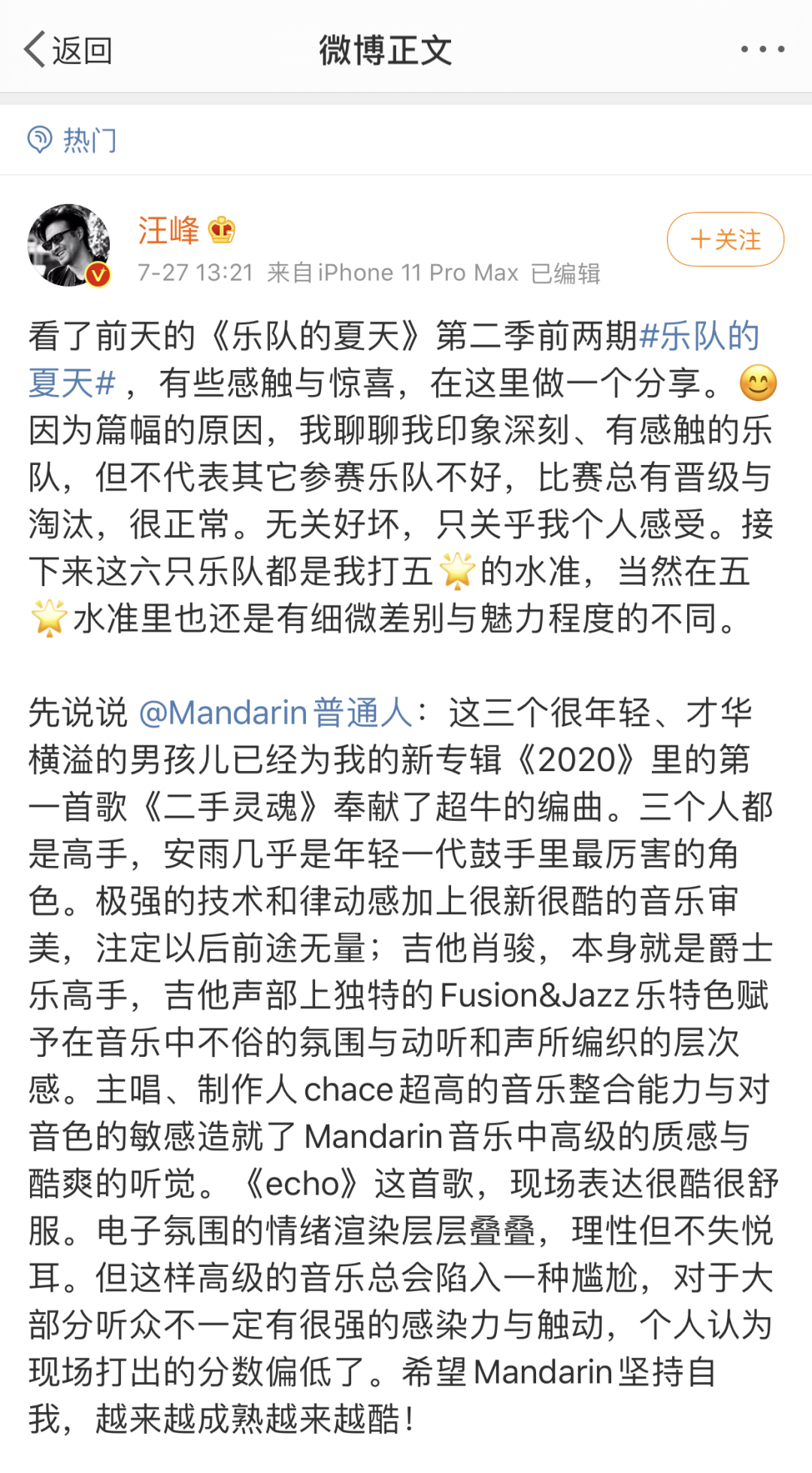 《乐队的夏天》播出后,汪峰也不吝啬赞美,“安雨几乎是年轻一代鼓手里最厉害的角色,极强的技术和律动感加上很新酷的音乐审美,注定前途无量。”