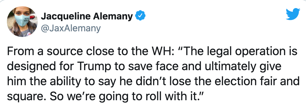 华盛顿邮报记者杰奎琳·阿莱曼尼(Jacqueline Alemany)上周六在推特上说,白宫消息人士告诉她,特朗普发起这些诉讼主要是为了“挽回面子”,最终他可以声称自己在不公正的情况下输掉选举。那我们跟着走就好了。”