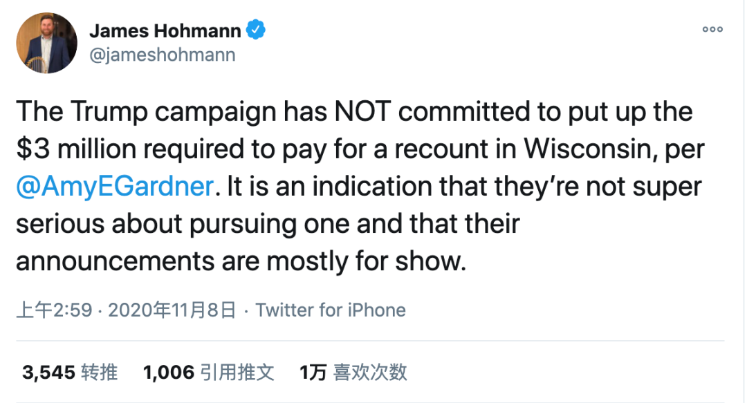 此前,民主党总统候选人拜登在威斯康星州的得票率反超现任总统特朗普0.7个百分点,特朗普竞选团队提出要求该州重新计票。但据《华盛顿邮报》政治记者艾米·加德纳(Amy Gardner)11月8日报道,特朗普竞选团队其实并没有拿出300万美元支付威斯康星州重新计票所需的费用。