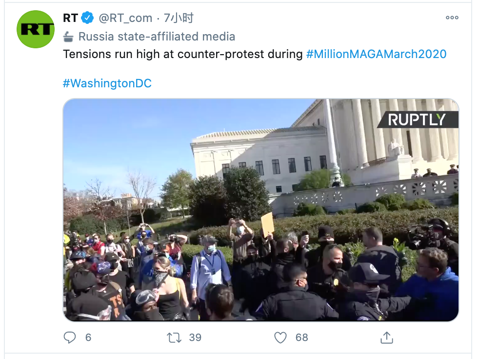 俄媒今日俄罗斯电视台(RT)当天报道则称,“反抗议者与抗议者(一度)在华盛顿爆发混战”。
