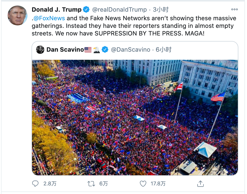 14日,特朗普在推特上大量转发游行现场相关图片及视频,称“人们不会容忍这次选举被一家私人激进左翼公司Dominion和许多其他原因窃取!”“我们会赢!”“成千上万的人在华盛顿表达他们的支持,他们不会支持一场被操纵和腐败的选举!”…….特朗普还痛批福克斯新闻和“假新闻”媒体并未报道这次集会,“相反,他们的记者却待在几乎空无一人的街上!”