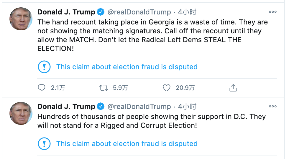 除此之外,他还发推炮轰佐治亚州的手工重新计票是在浪费时间,呼吁取消重新计票,“不要让激进的左翼民主党人窃取选举!”他还称,“他们不让我们的投票监督员和观察员进入计票室。单凭这一点我们就能赢!”