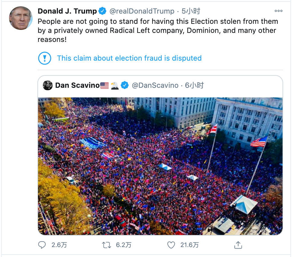 当地时间14日,特朗普支持者“齐聚”在华盛顿特区举行“MAGA百万人游行”(the Million MAGA March),抗议所谓“存在舞弊”的选举结果。美国总统特朗普除了早早在现场打个照面外,还在推特上“声援”。