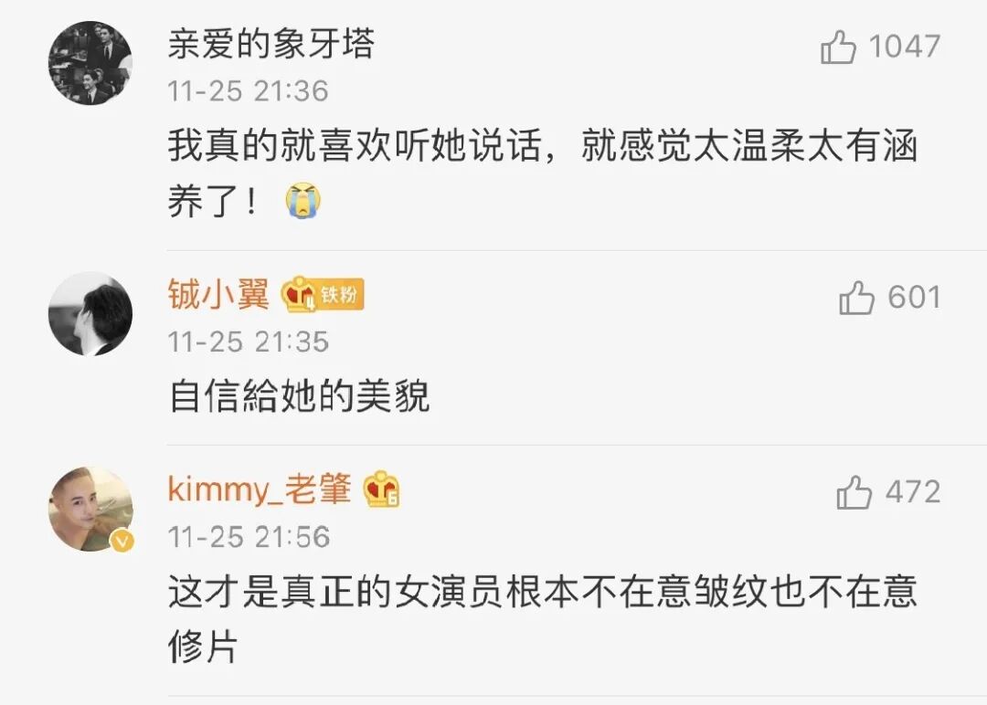 怎么说呢,虽然咏梅已经用尽量不情绪化的语气谈论“女演员的皱纹”,但这个提议确实是有点曲高和寡,无法推而广之,而让人得出“真正的女演员根本不在意皱纹”这样片面的结论,恐怕也并非她的本意吧。