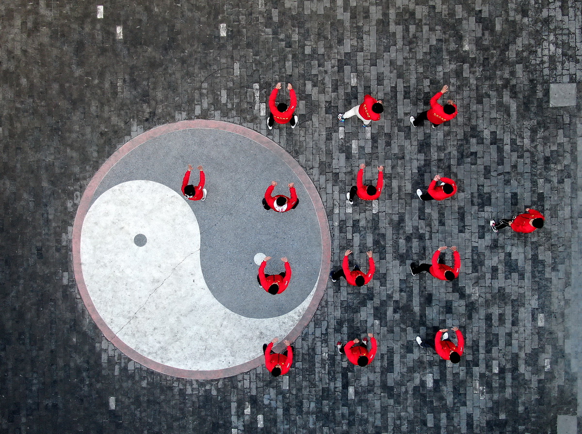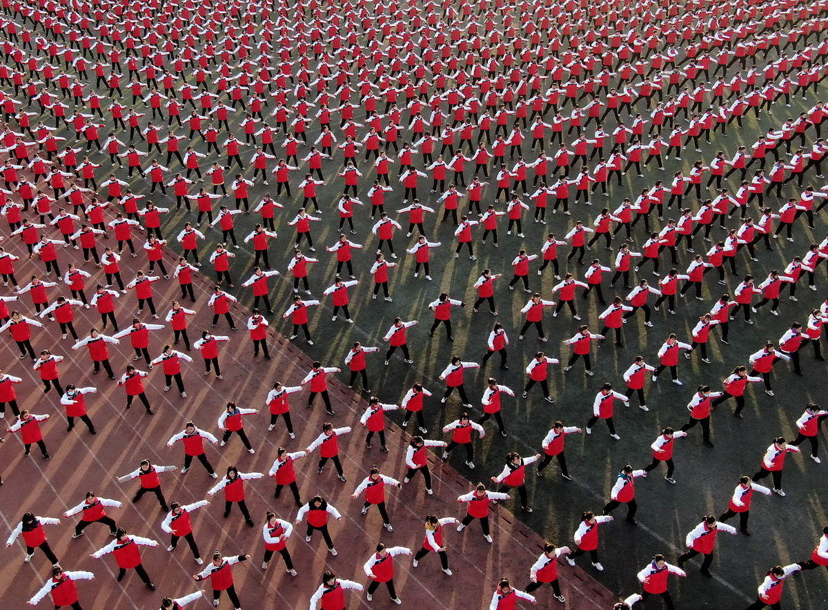 10河南省焦作市温县第一高级中学的学生在操场上练拳(无人机照片,12月15日摄)。