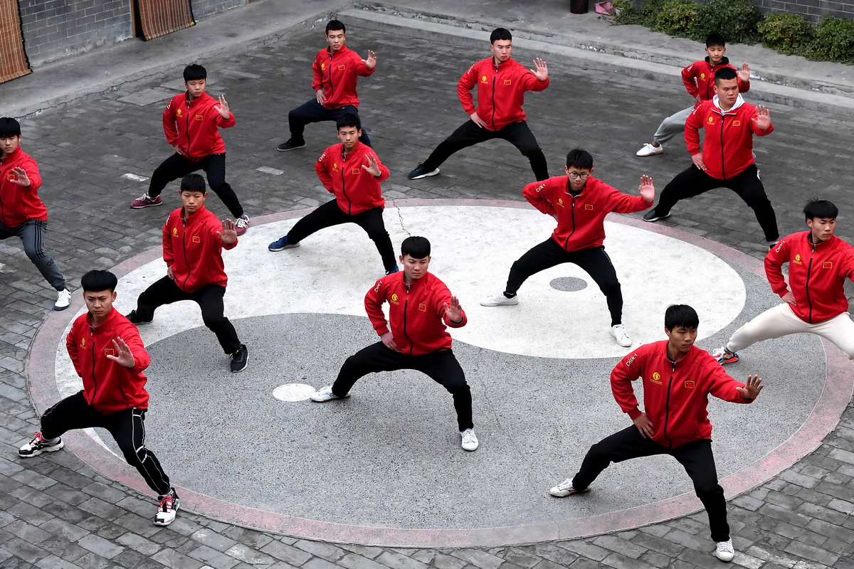 10在河南省焦作市温县陈家沟太极拳祖祠内,一家太极拳学校的学员在练拳。