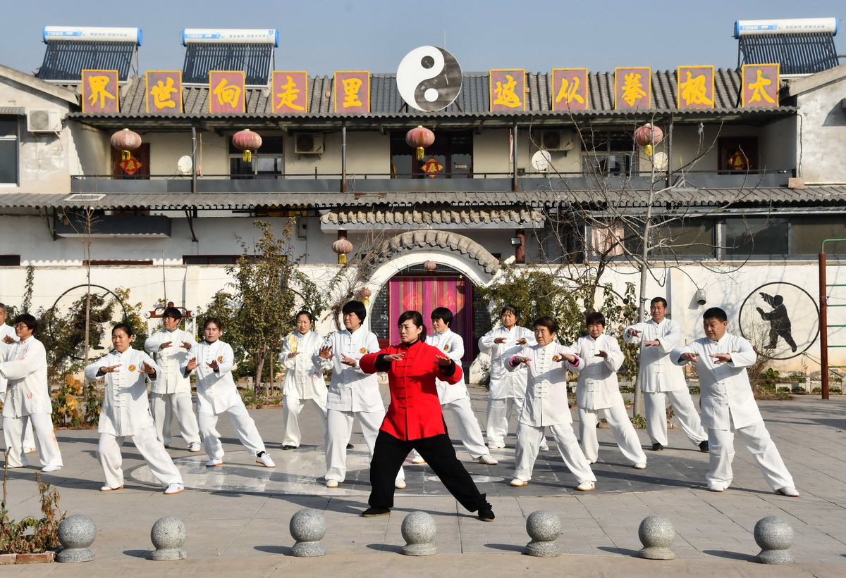 10太极拳爱好者在河北省邯郸市永年区太极小镇习练太极拳。
