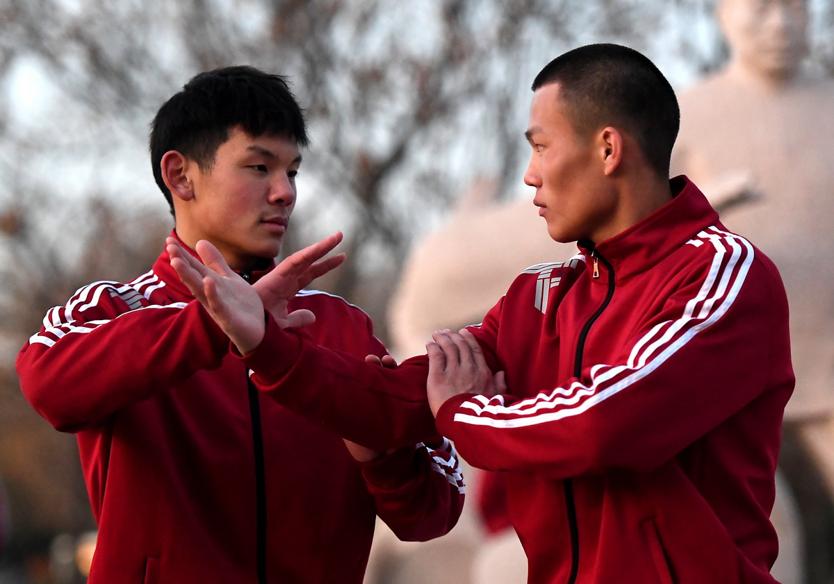10两名小朋友在河南省焦作市温县陈家沟一处拳馆外习练太极拳。