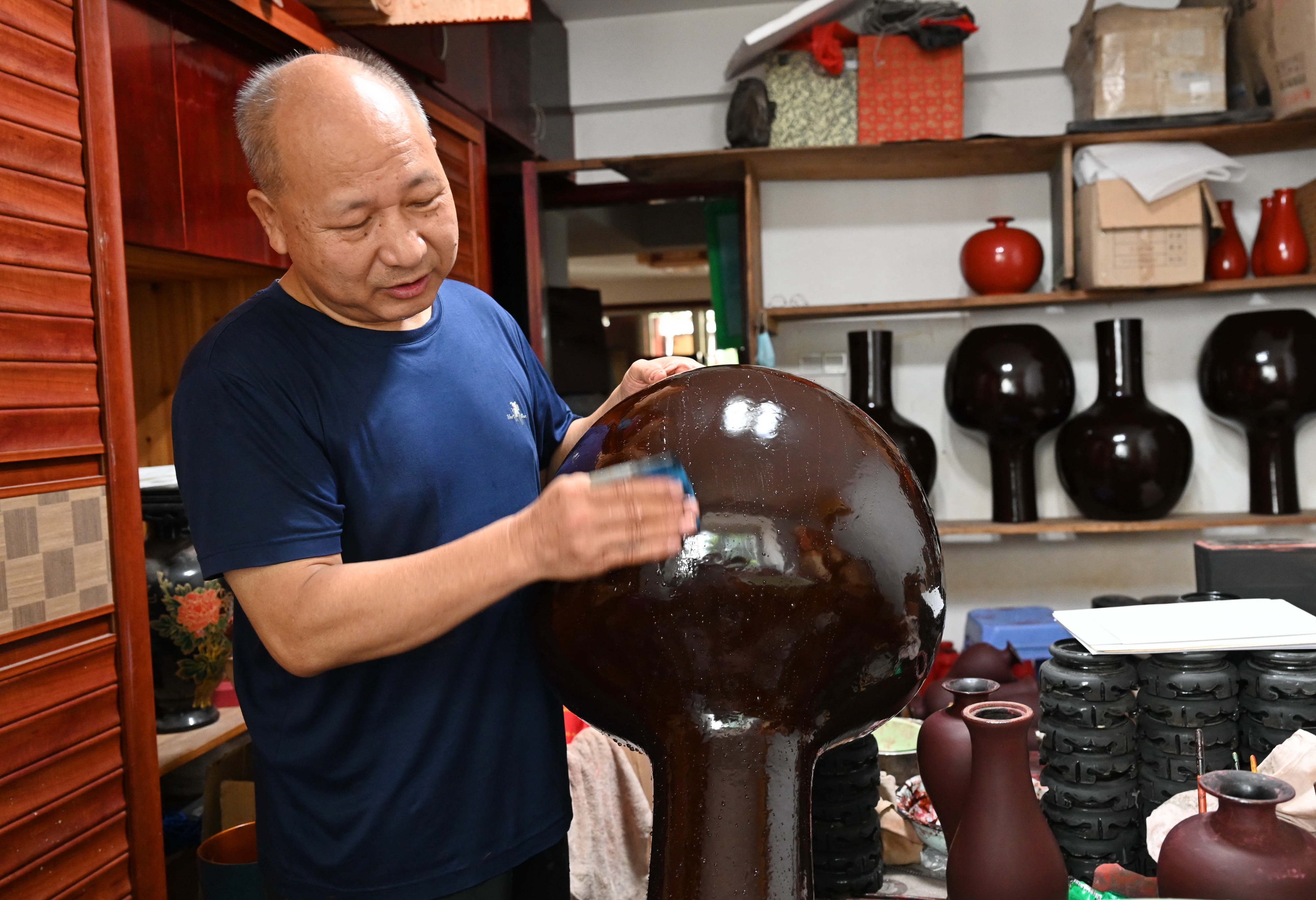 9脱胎漆器制作师傅洪兆惠在福州市仓山区的工作室进行脱胎漆器制作中的胎面细磨工序。