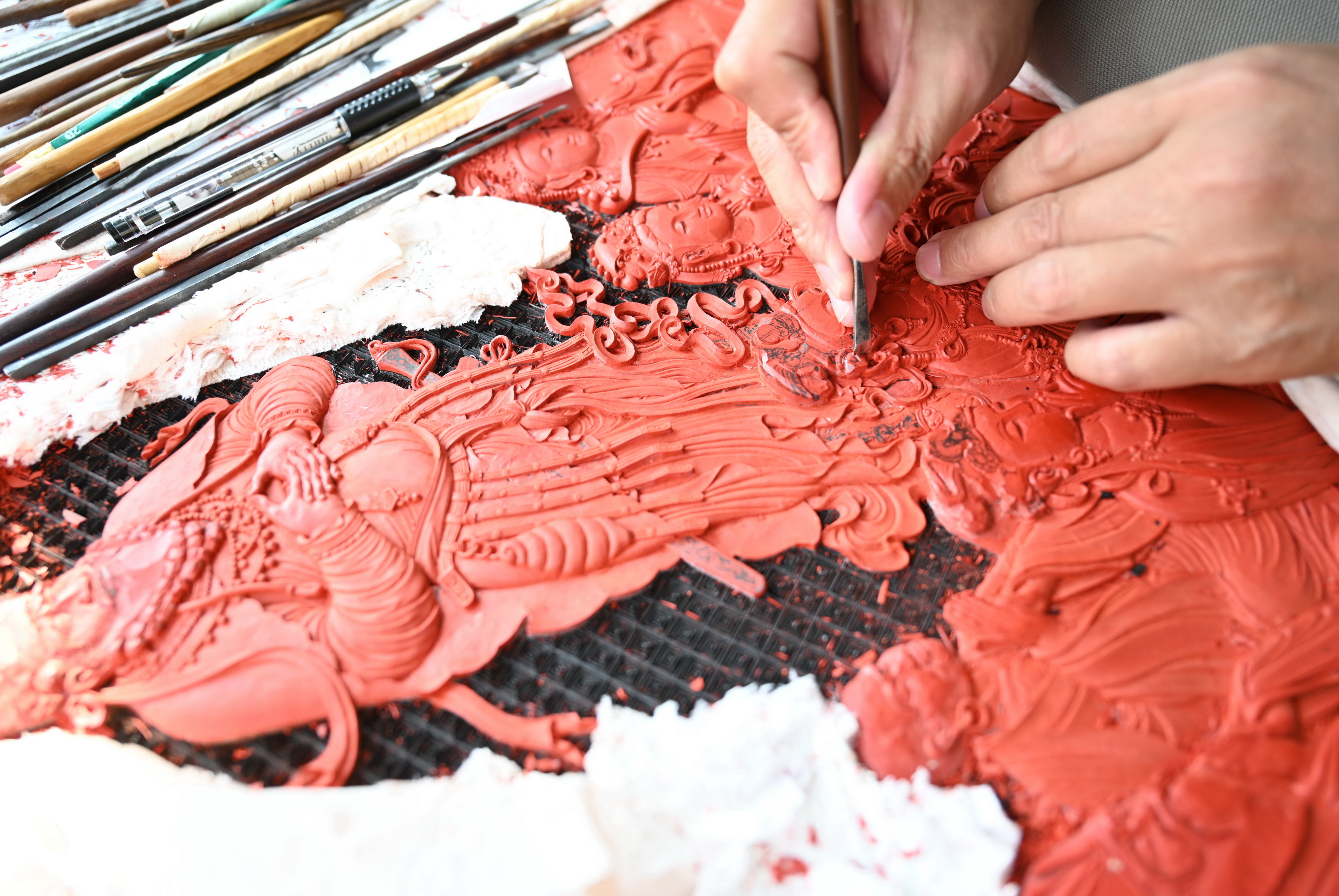 9工作人员在制作福州雕漆作品过程中的雕剔工艺程序。