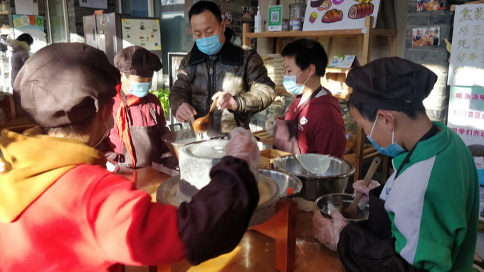 豆腐工坊的学生就在创业导师的指导下,对本地豆腐销售情况进行了调研,还制作了营销海报。最终,他们把豆腐推广到了北京十一学校的食堂,还就近和北京汇贤府餐厅签订了采购合同。现在,九渡河小学食堂每天能卖出60多斤浆水豆腐。学生们还面向本地的农家院和餐厅做推广,目前已与新利餐厅达成销售意向。